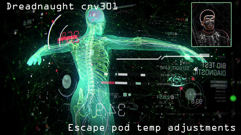 As the temperature starts to adjust a clear sound of fans and what resembles heaters kicks in. Dex takes a liberty to also display facial cams of each person in the bridge directly to the pod to make the mental processing for the occupant more toloratible. Each video feed showing the location on the ship and who is in what chair of the bridge.